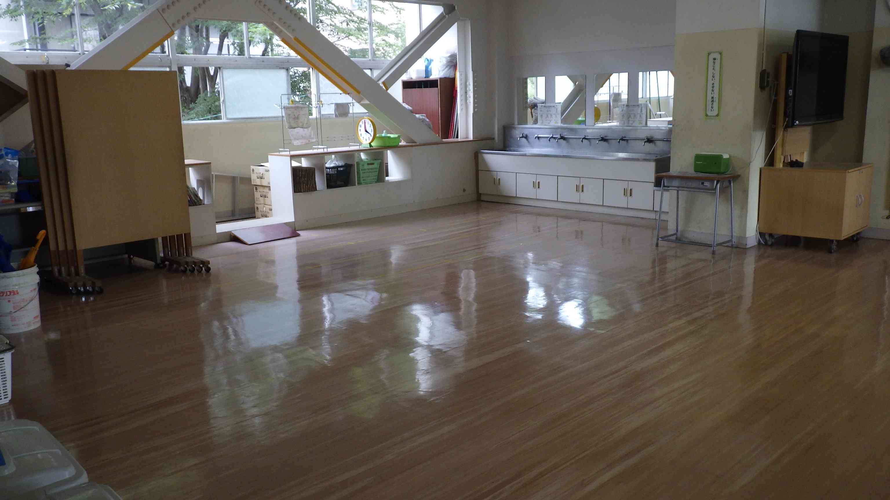 子どもたちが気持ちよく過ごすことができるようにと、用務さん2人が1日がかりでワックスをかけて、学校中をピカピカにしてくださいました。子どもたちも濡れているみたいに光っていると大喜びです。