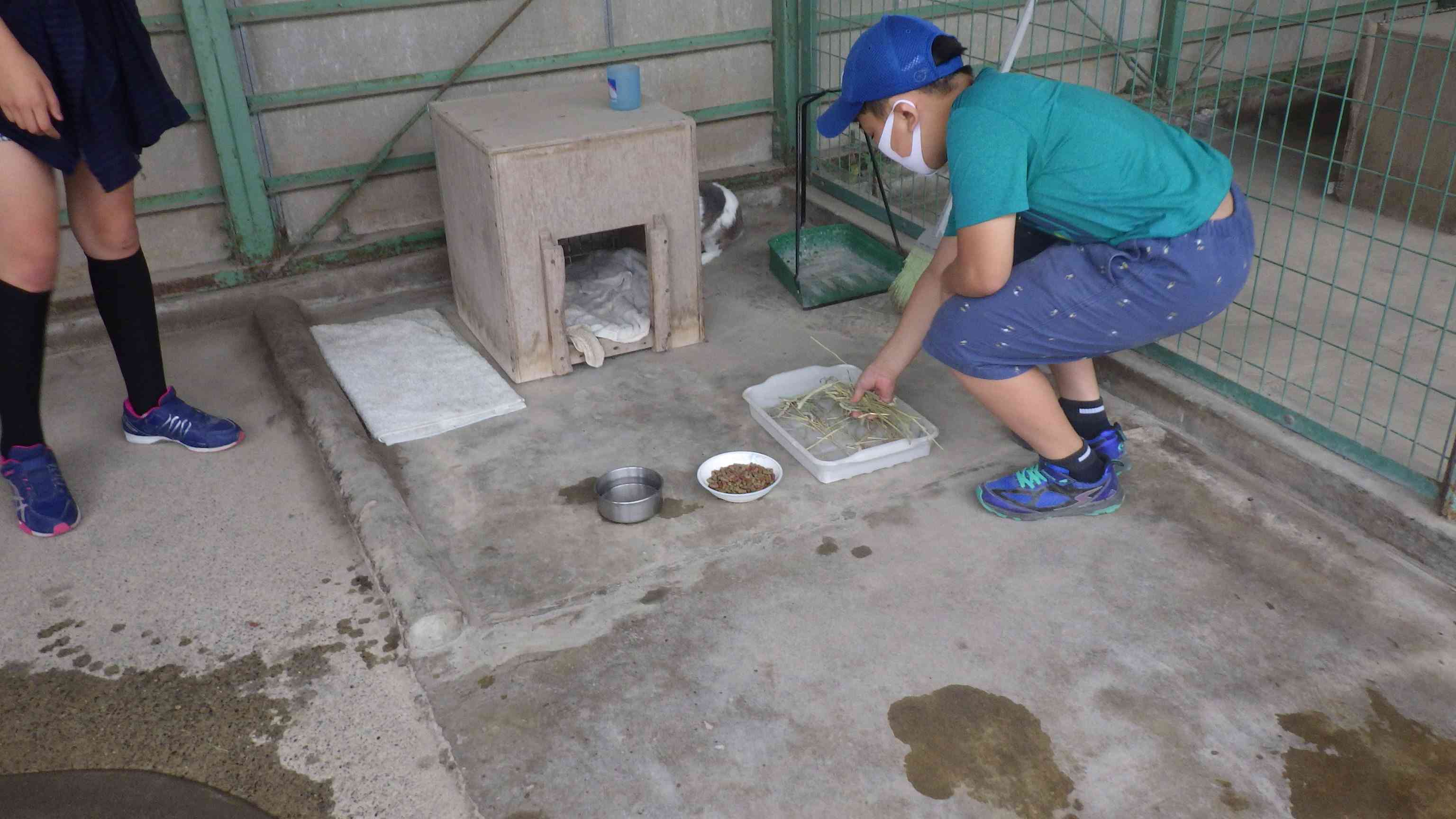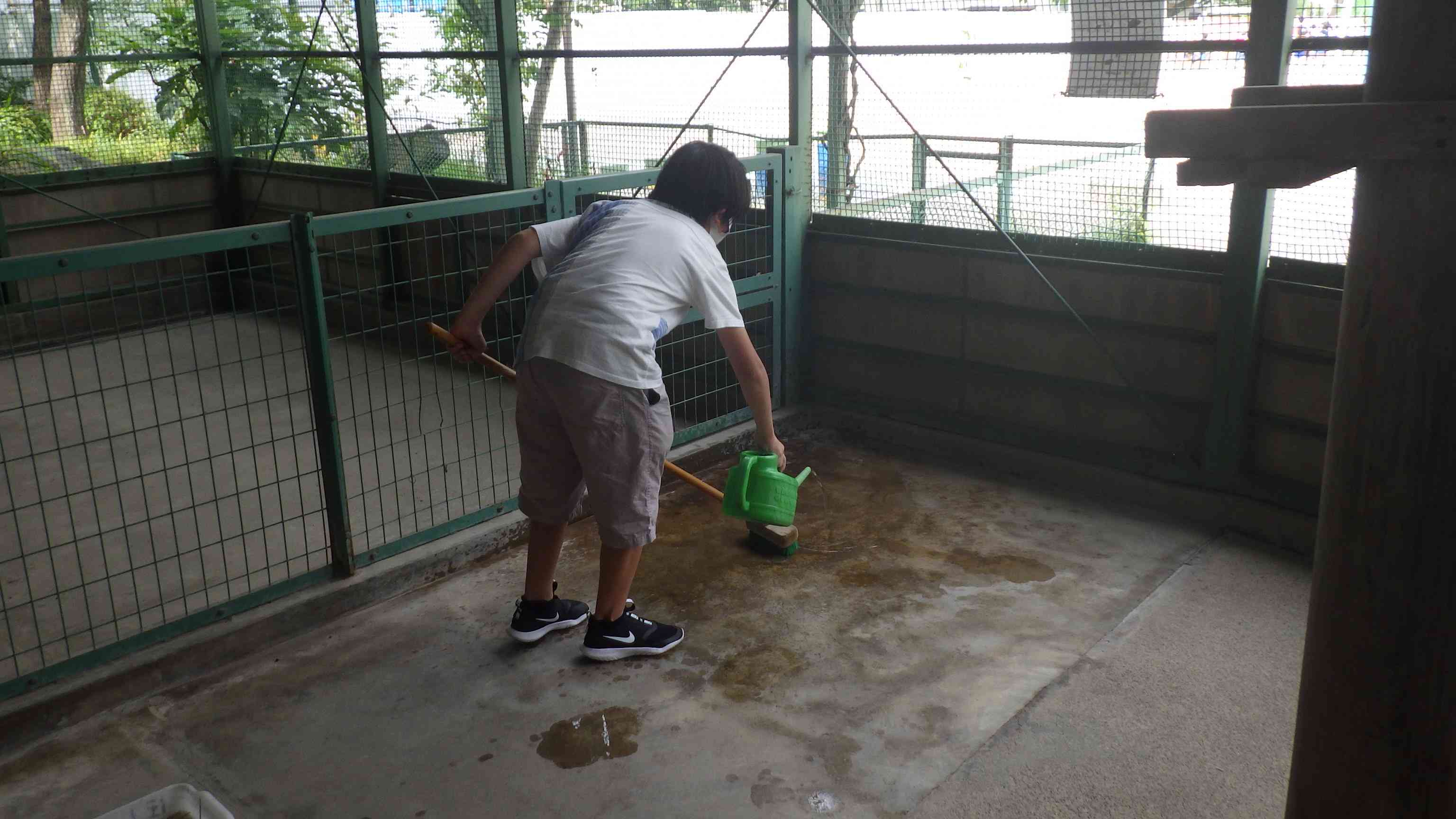 飼育委員会は、毎朝8時から15分間、ウサギ小屋の掃除とえさやりをしています。汚れたところを水できれいにしてうさぎの「ミルク」が気持ちよく生活できるようにしてあげています。暑い日はぐったりしていても子供たちが小屋に入ると嬉しそうに走り回ります。一番下の写真は、「ミルク」がお気に入りの場所です。