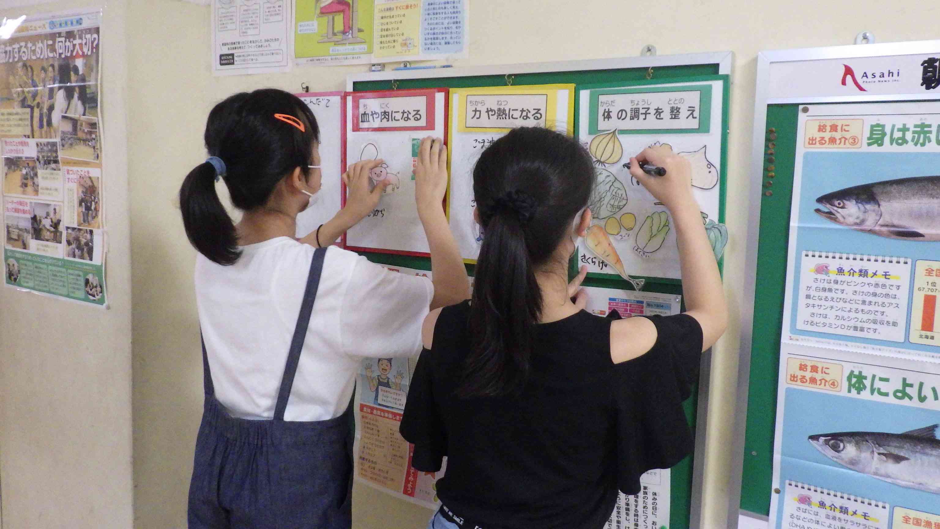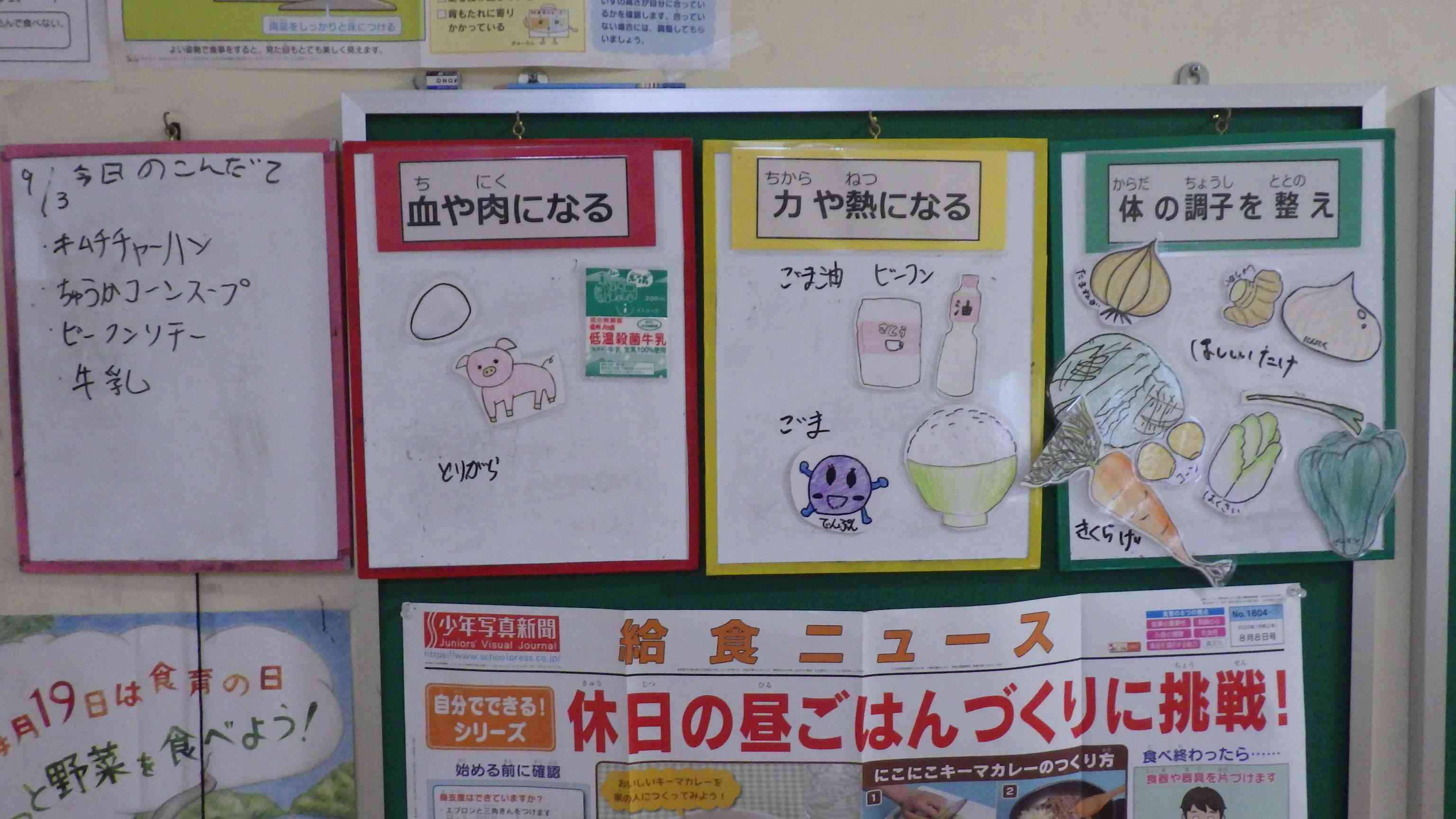 給食委員会では、毎月の目標を考えてポスターを作り、各クラスに行って給食の大切さを理解してもらえるように啓蒙しています。また、2階の廊下には、今日の給食の献立を掲示し、どの食材が体のどこに栄養を送るか一目でわかるように工夫しています。給食でも全員が健康な身体になってほしいと願っています。