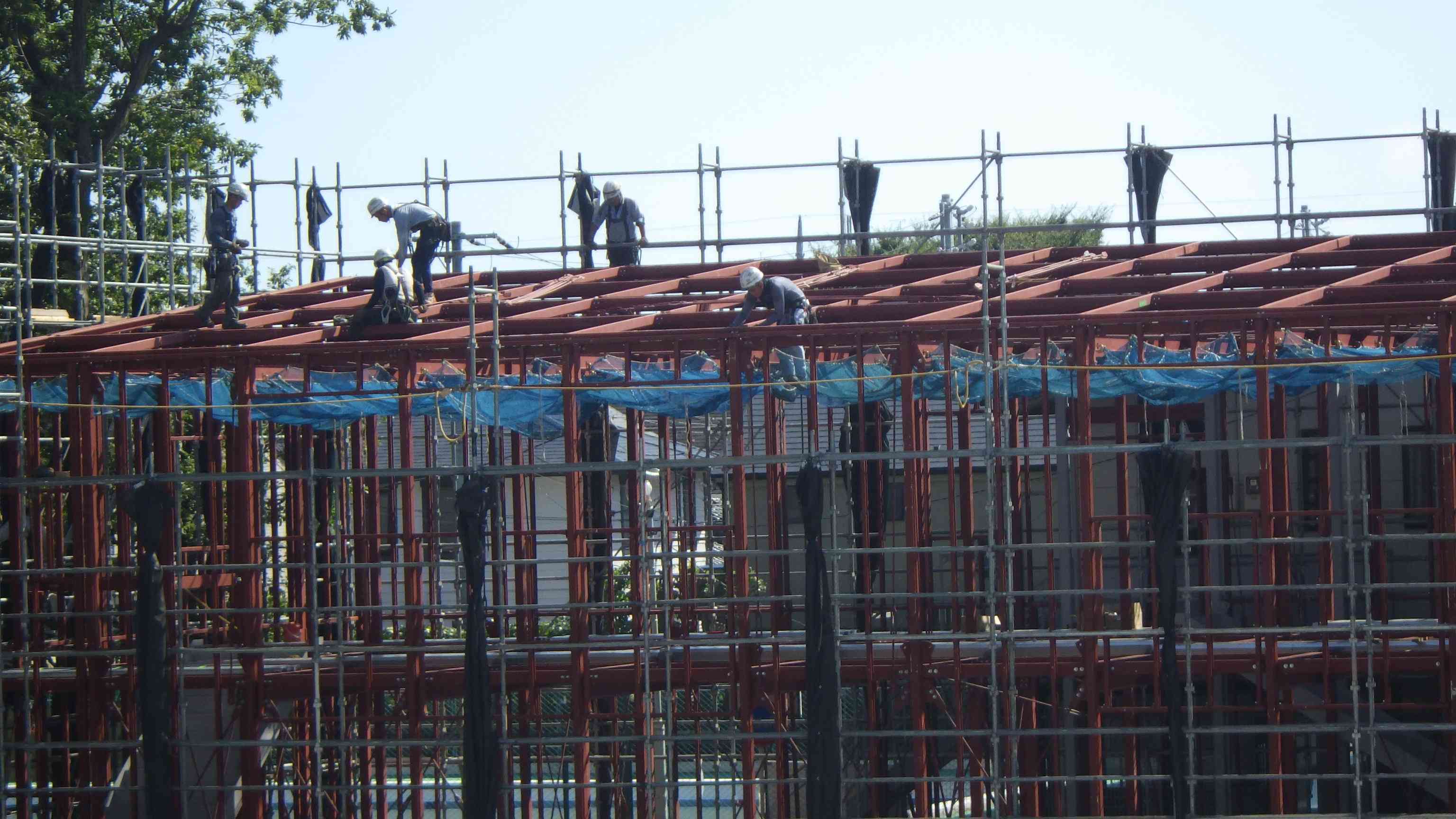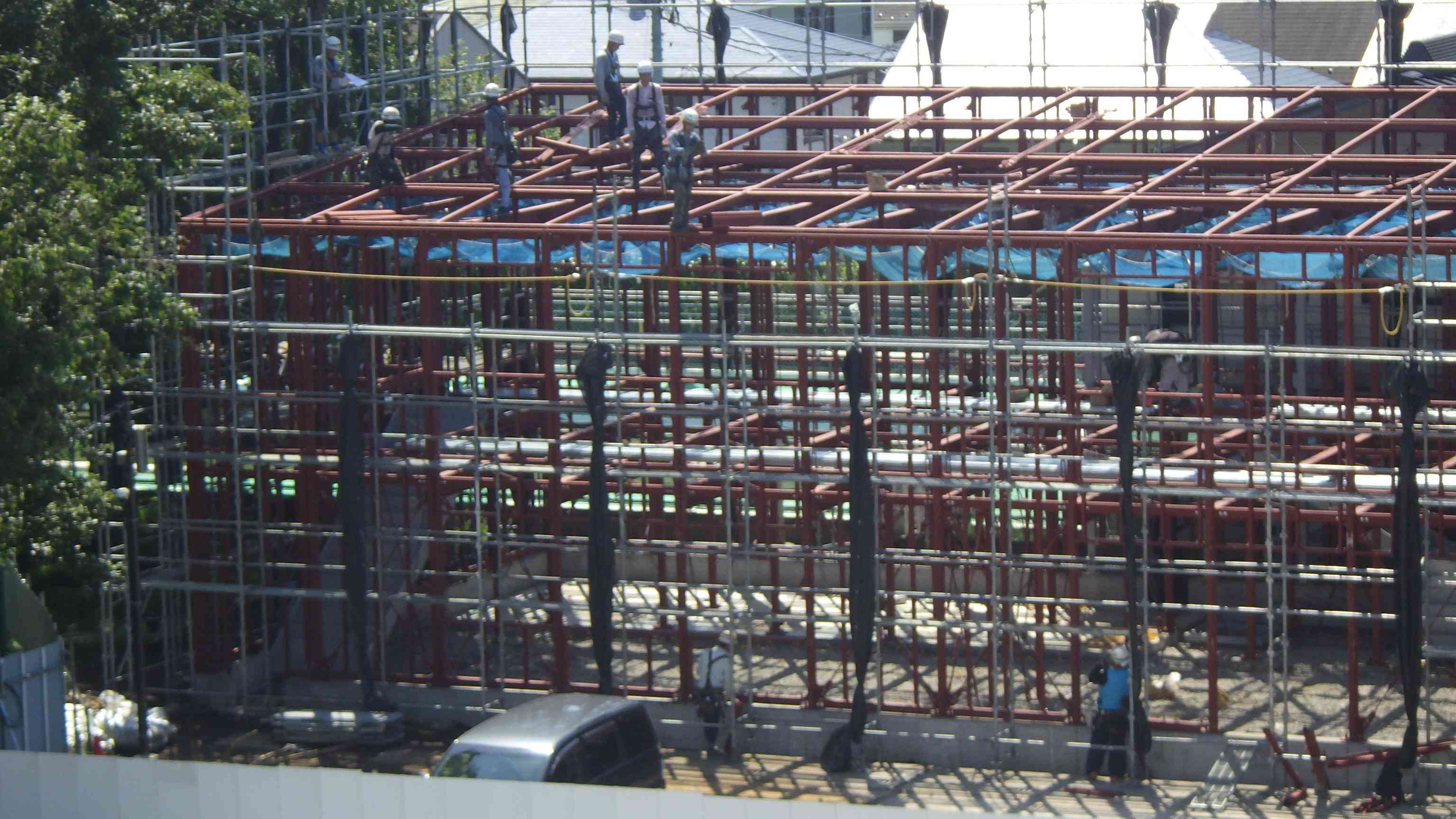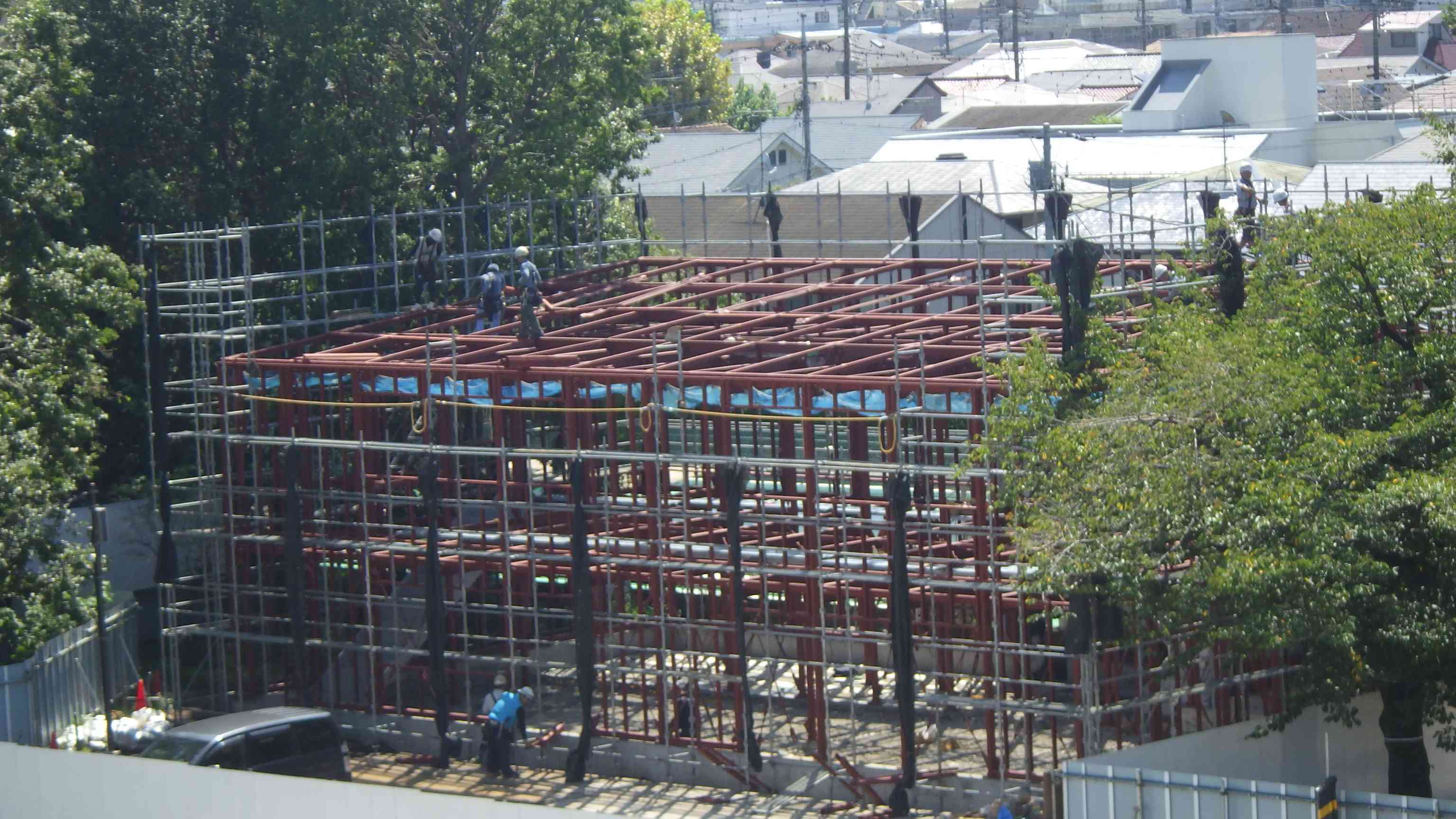 屋根までの骨格ができました。作業員の方々は、こんなに高いところで何にもつかまらないで仕事をしています。見ているだけでドキドキしてしまいました。