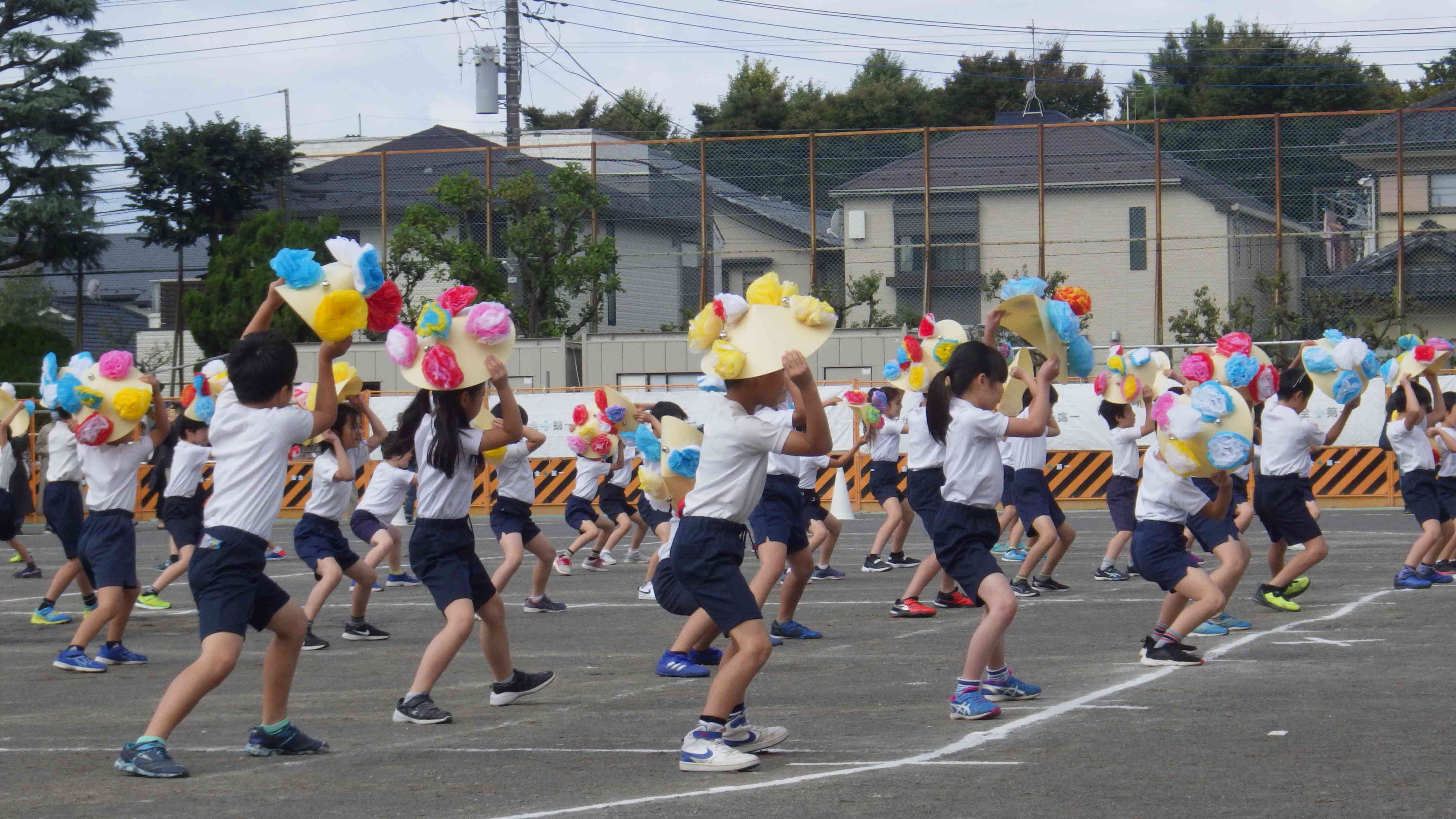 3年生は、「花笠音頭」を踊りました。自分で作った花笠を手に、「リズムに合わせて 大きく踊ること」をめあてに取り組みました。民謡調、ロック調の2曲を、雰囲気の違いを出しながら楽しんで表現できました。
