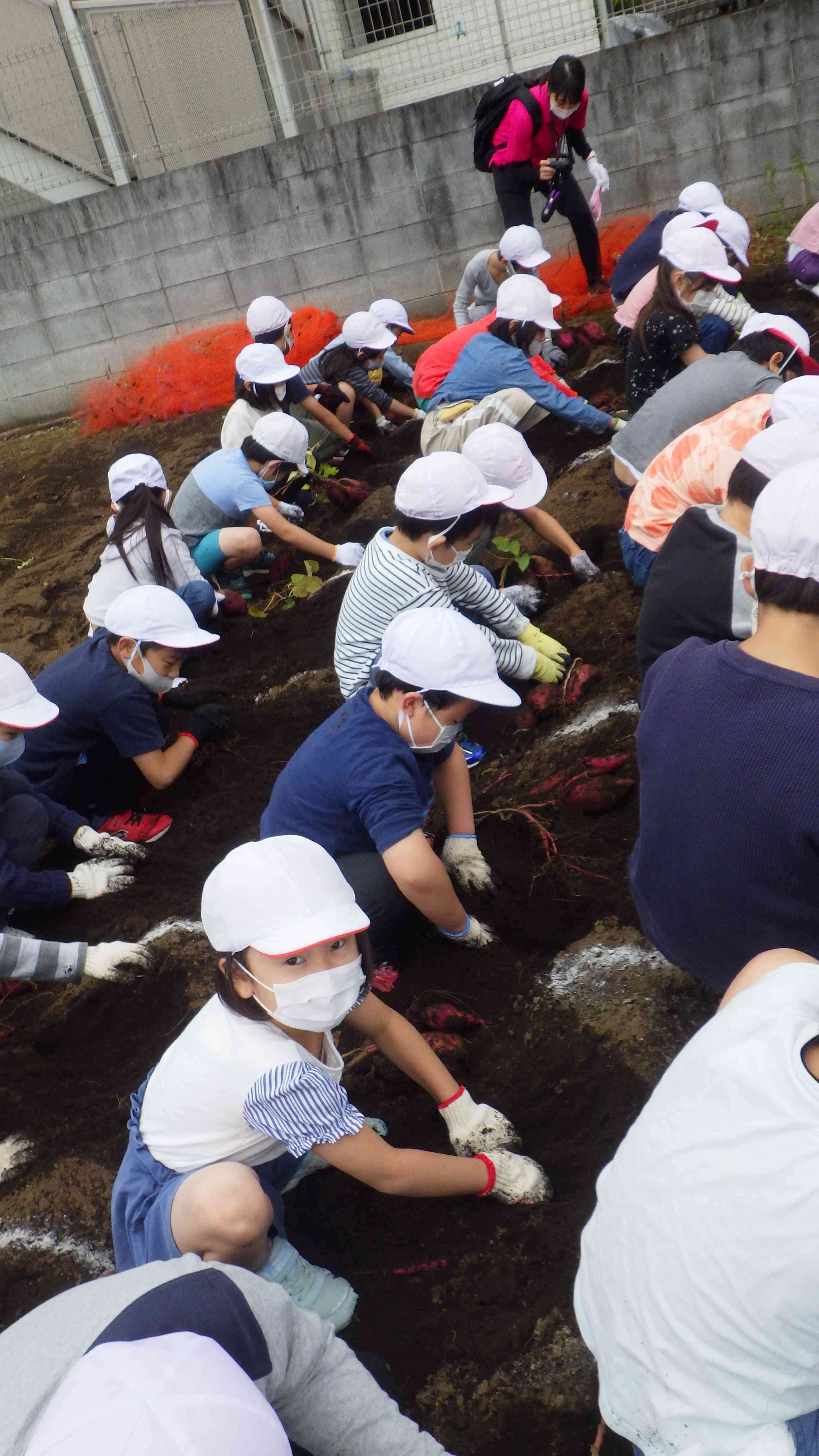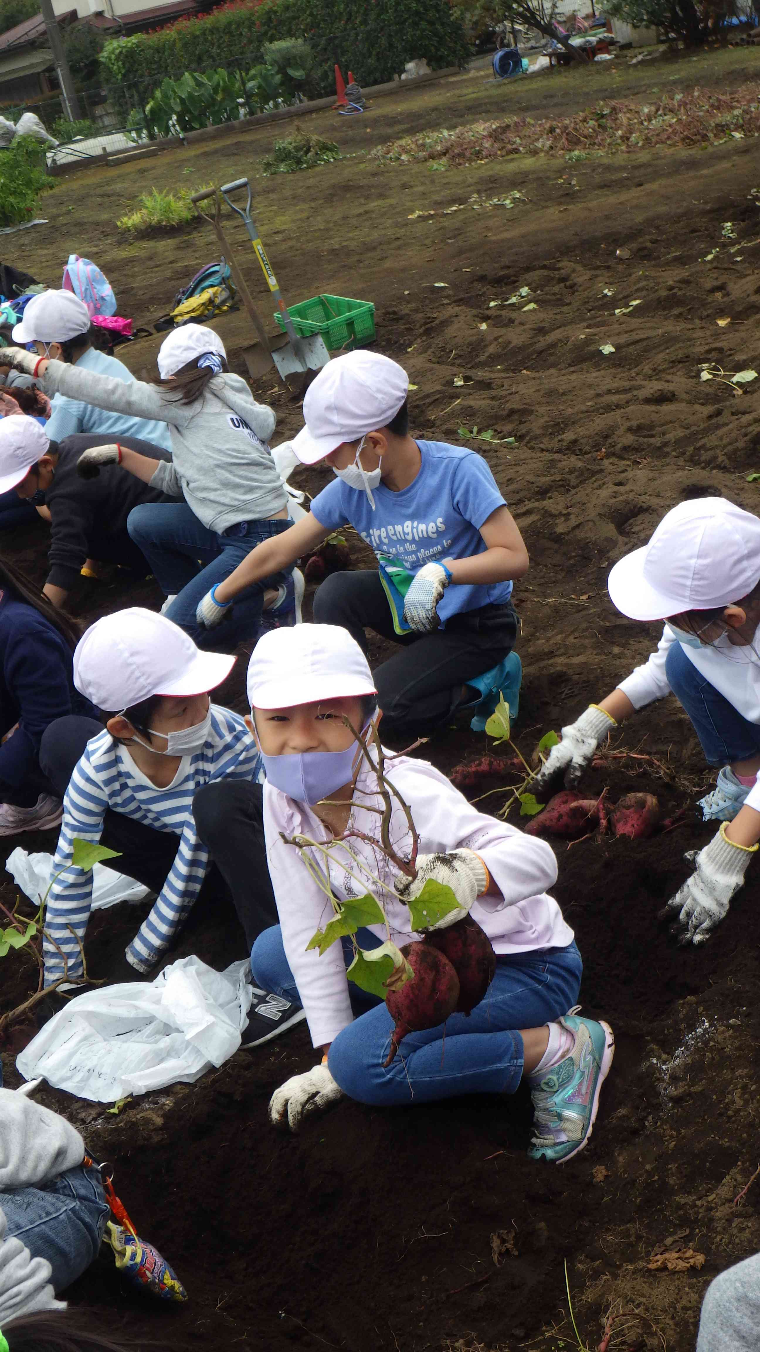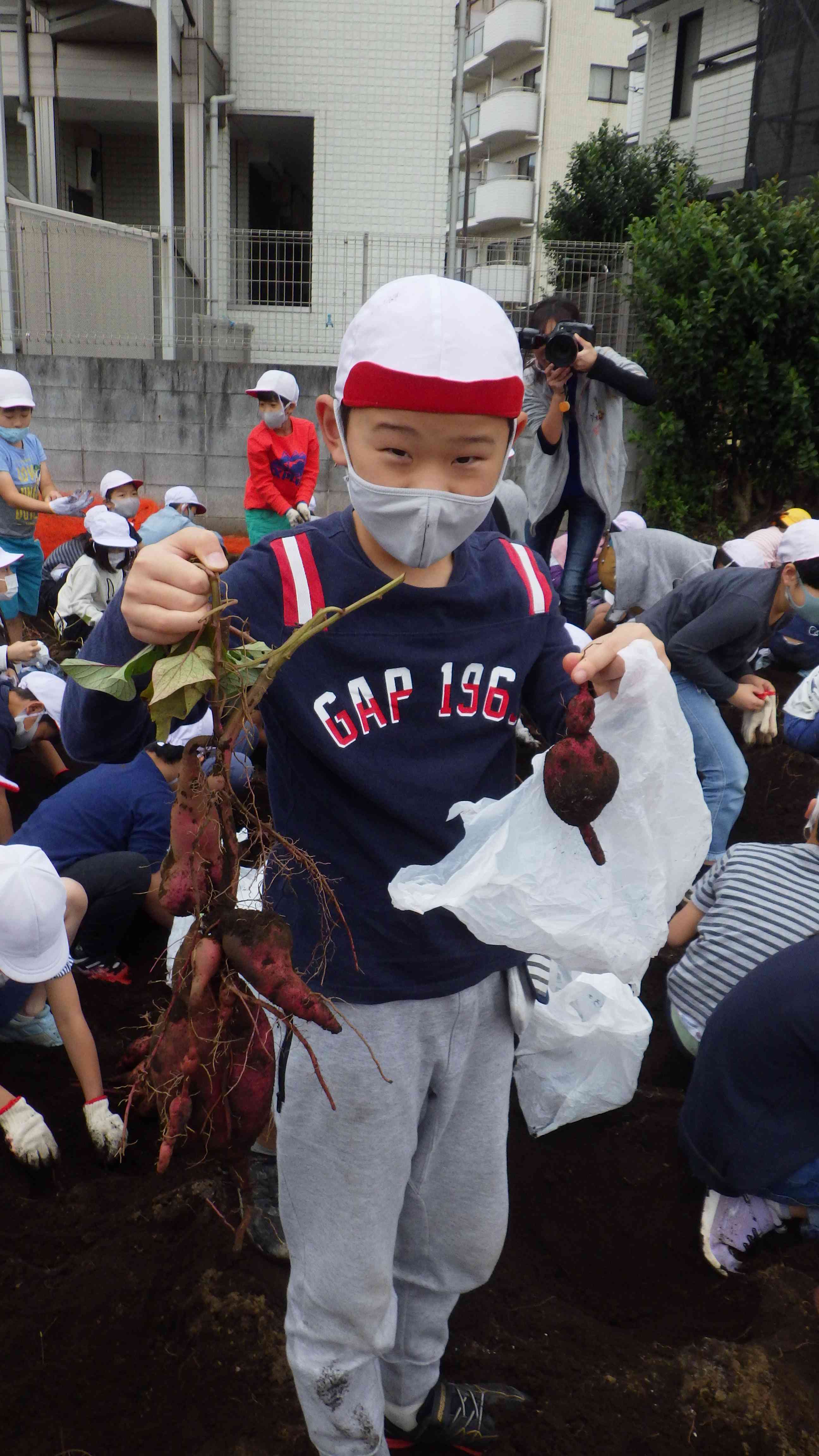 秋晴れの空の下、1・2年生合同で、さつまいも掘りに行ってきました。 大きなお芋がたくさん掘れて、行きは軽かったリュックサックが、帰りにはとても重たくなっていました。お家で、おいしく食べているかな♥