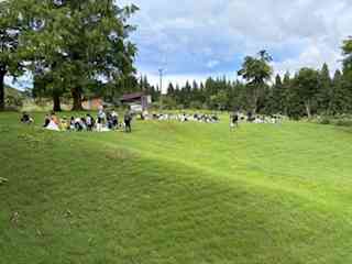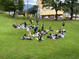 スキー場センターハウスの隣、芝生の広場で昼食をとりました。
