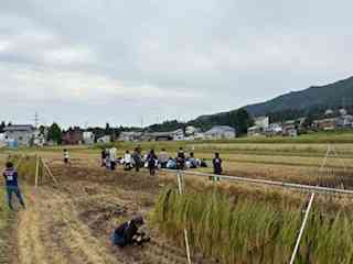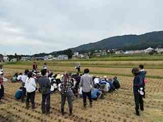 稲を刈りとって最後のまとめをしています。 みんなで協力して予定時間よりも早く終えることができました。